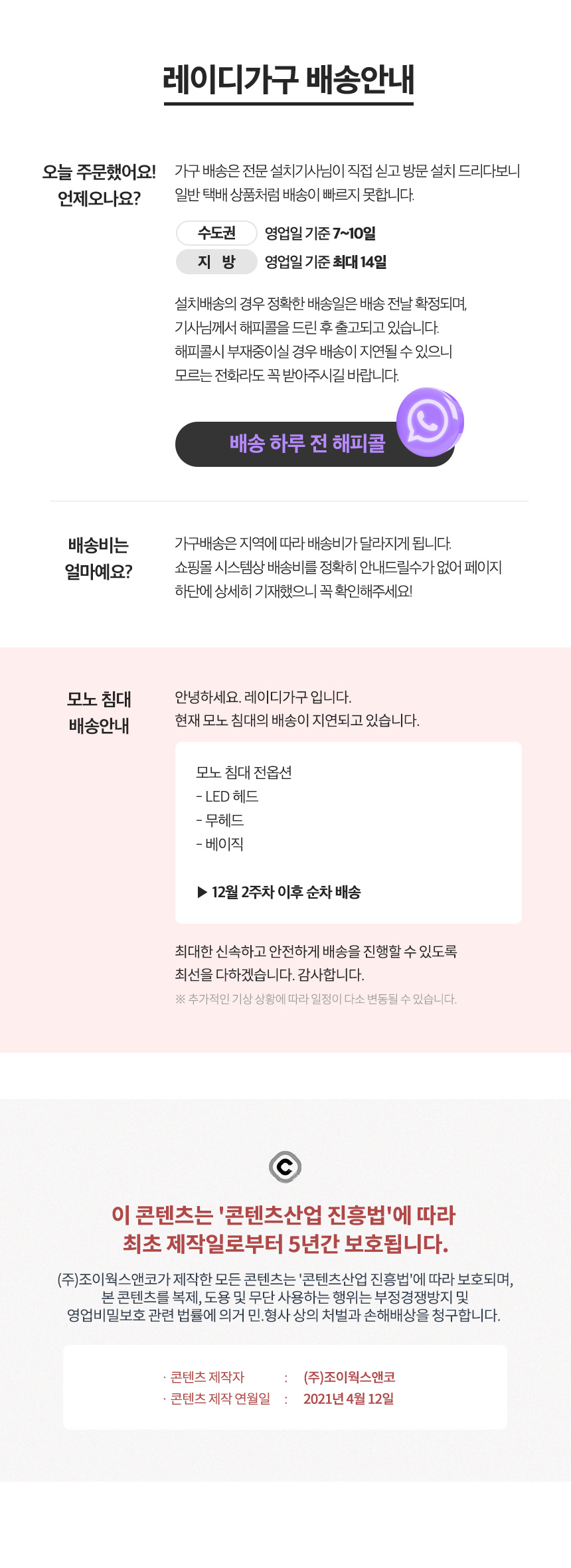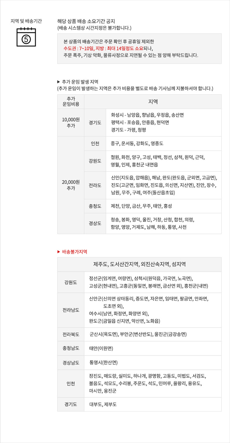 | 배송·설치비용 | 지역에 따라 차등 부과됨.(엘리베이터 사용료, 사다리차, 배송차량 주차료등 추가적으로 발생하는 비용은 고객님부담 | ||