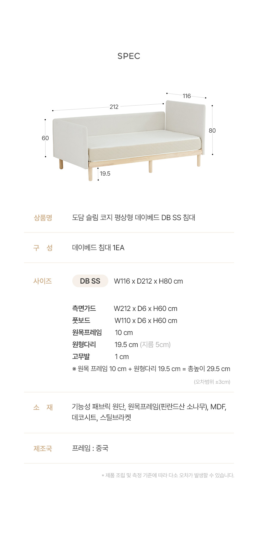 | 크기 | W 116 x D 212 x H 80 (cm) (오차범위 3%) | ||