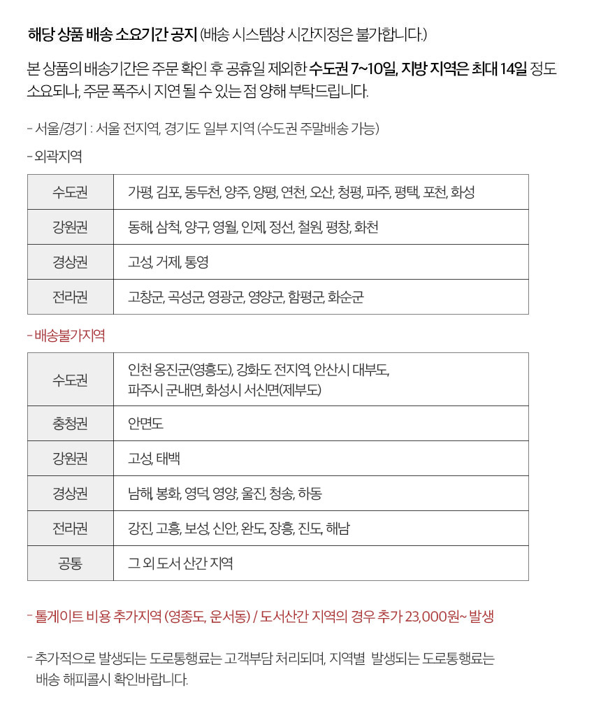 | 배송·설치비용 | 지역에 따라 차등 부과됨.(엘리베이터 사용료, 사다리차, 배송차량 주차료등 추가적으로 발생하는 비용은 고객님부담) | ||
