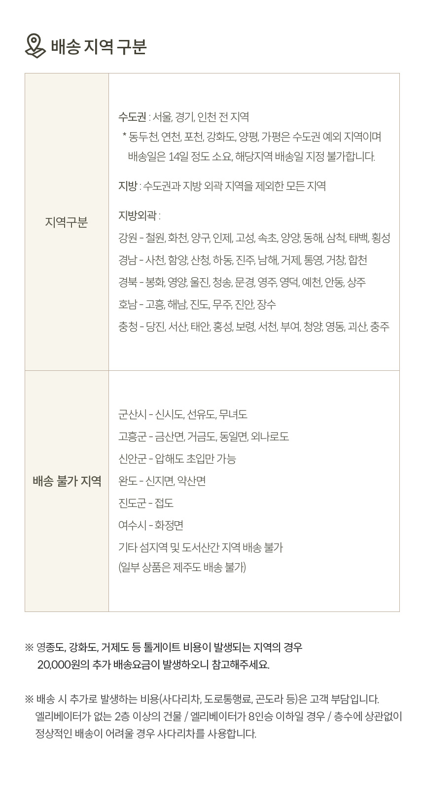 | 배송·설치비용 | 지역에 따라 차등 부과됨 (엘리베이터 사용료, 사다리차, 배송차량 주차료 등 추가로 발생하는 비용은 고객님 부담) | ||