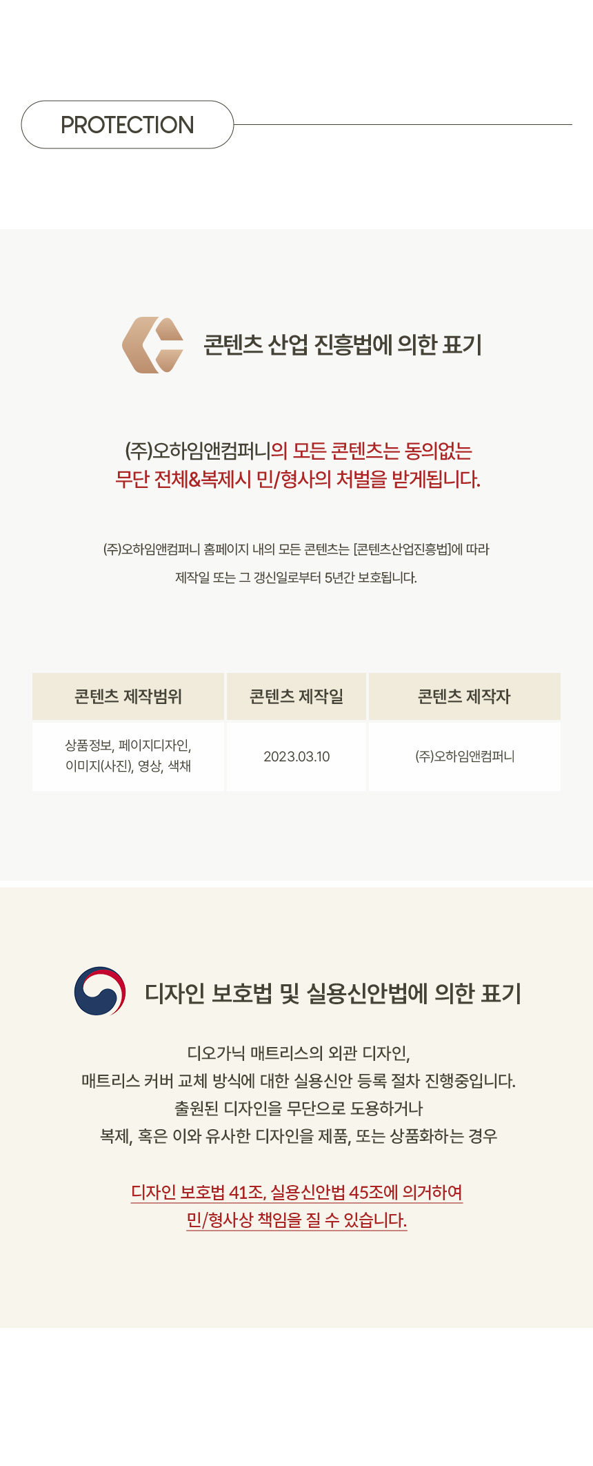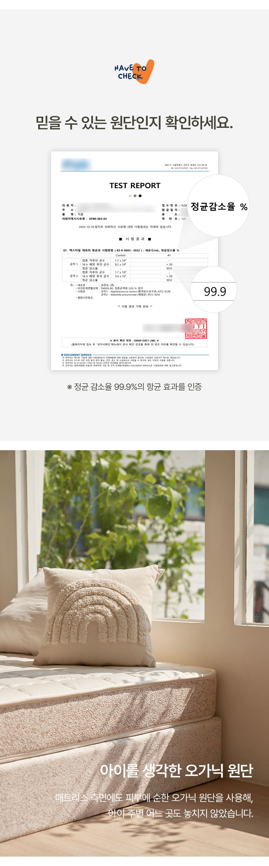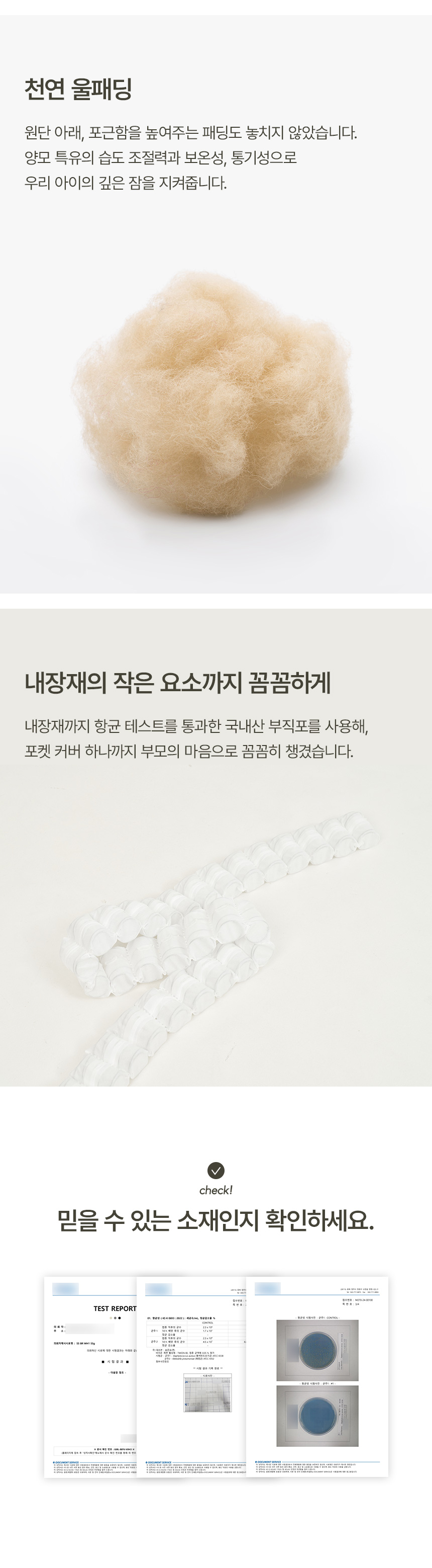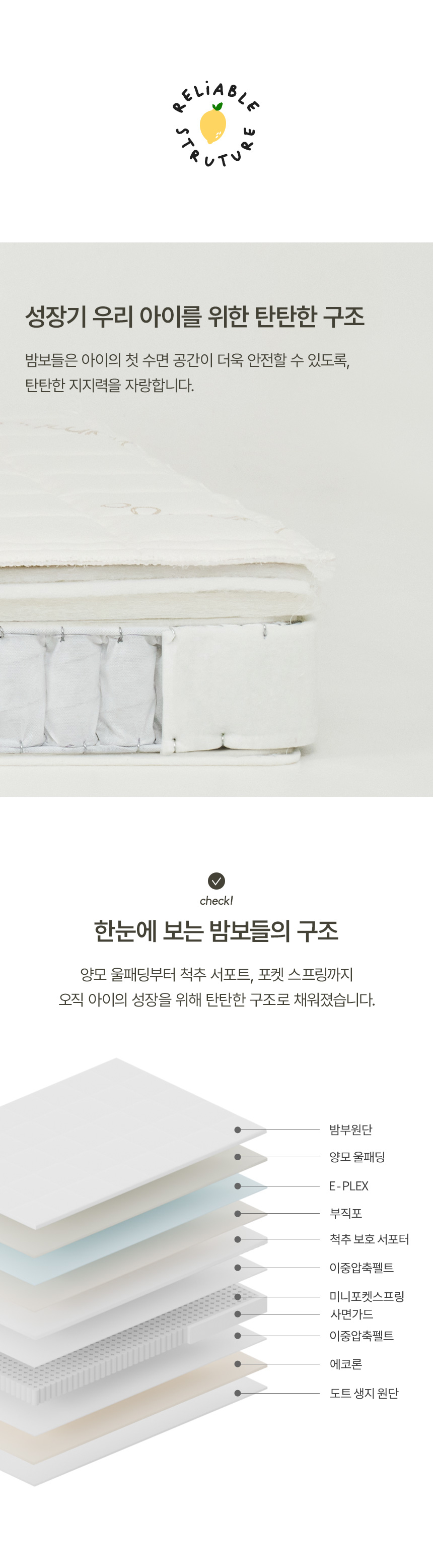 | 주요 소재 | 밤부원단, 삼중지오가닉원단, 도트 무지 원단, 울패딩, 척추보호서포터, E-PLEX, 부직포, 이중압축펠트, 사면가드, 에코론 외 | ||