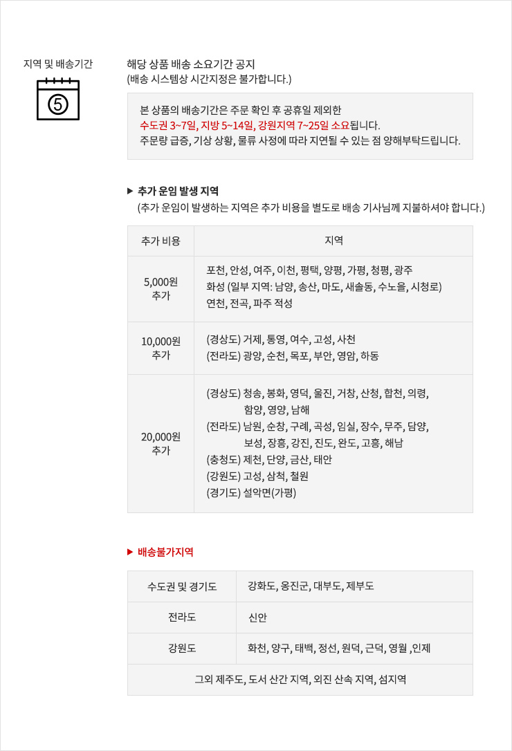 화물 직접배송 / 지역별 차등 배송비 / 하단페이지 참조